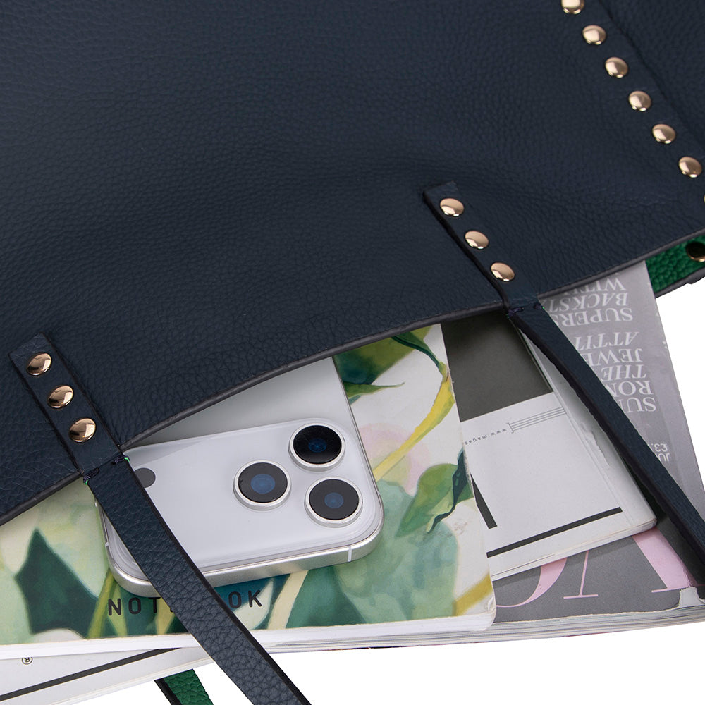 An ever-stylish leather tote that adjusts according to your needs. Legacy's reversible tote allows you to switch seamlessly between two striking colors with just one move. Made with genuine leather and enhanced by metallic studs that embody contemporary style, the tote is perfect for the office, travel, or any sophisticated occasion.